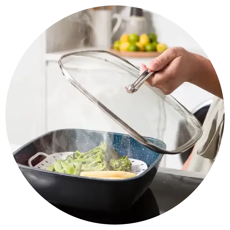 • Tempered Glass Lid with Steam Vent