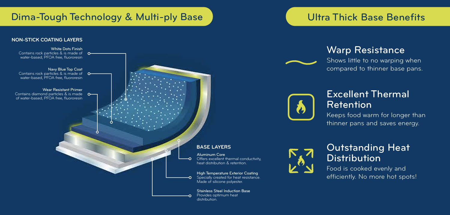 The coating is made of water based PFOA free fluororesin and infused with diamond & rock partials making non-stick & Dima-Tough™.